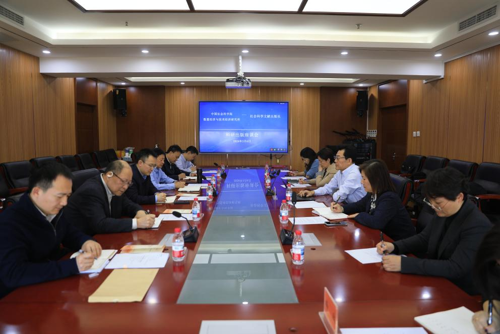 2026 年 3 月 6 日,我所与社会科学文献出版社(以下简称“社科文献社”)所就科研出版合作举办工作座谈会。社科文献社党委书记、社长冀祥德,党委委员、副社长梁艳玲,经济与管理分社社长恽薇,国际出版分社社长李延玲,皮书分社副总编辑吴敏,总编室主任兼中国式现代化研究丛书出版工程办公室主任梅玫,行政安保部科长岳鹏飞,数技经所所长、党委副书记张友国,纪委书记、副所长薄延忠,科研处处长韩胜军,宏观政策与评价研究室主任冯明,编辑部主任郑世林,科研处黄亦斌参加座谈,会议由张友国所长主持。